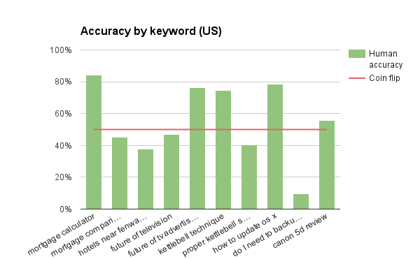 So, even though the overall accuracy was a little above 50% in the US (around 56% or roughly 5/9), I’m not actually convinced that US SERPs are generally easier to understand. I think there are a lot of US SERPs where human accuracy is in the 40% range.